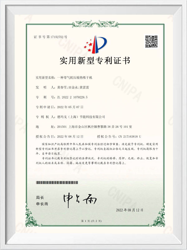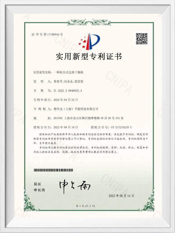 Certificado de patente de modelo de utilidad de secador de succión sin calor de alta presión