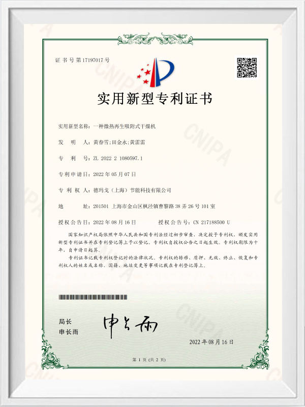 Certificado de patente de modelo de utilidad de secador de adsorción regenerativa microtérmica
