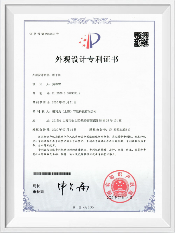 Un certificado de patente de modelo combinado de secadora sin calor y utilidad