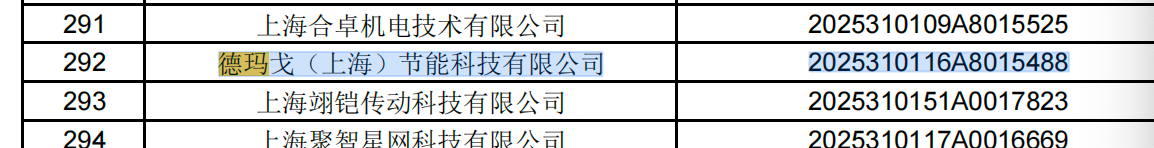 Entre las empresas seleccionadas, Demargo (Shanghai) Tecnología de ahorro de energía Co., Ltd. ha sido listado exitosamente, con el código de registro 2025310116A8015488 .